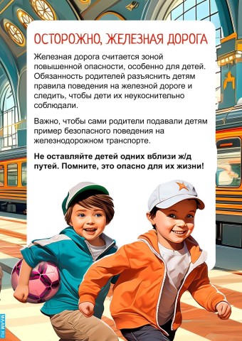 Уважаемые родители! Объясняйте детям правила безопасности на железной дороге, потому что они не всегда способны правильно оценить ситуация и распознать опасность. Убедительно просим не оставлять без присмотра малолетних детей. При пересечении железнодорожных путей просим смотреть по сторонам и снимать капюшоны, которые ограничивают видимость. Не забывайте, что прослушивание музыки в наушниках или разговор по телефону снижает бдительность.